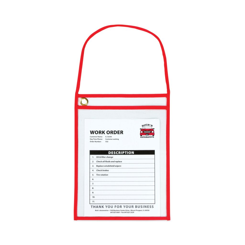 Store, protect and organize your instructions, production schedules, inventory cards, work orders and much more. The convenient strap allows you to hang the job ticket on a car mirror or factory machine, while you are working on the job. Great for hooks, pegs, vehicle mirrors or machinery. Super heavyweight holder has stitched seams for long-lasting utility. Clear Back — Red Stitching & 22″ Strap. Load Orientation: Top; Sheet Capacity: 75; Sheet Protector Type: Shop Ticket; Insert Size: 9 x 12.