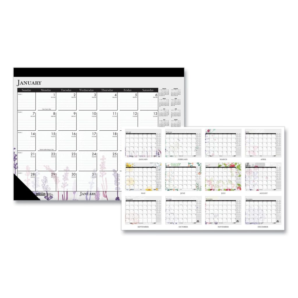 Brighten up your desk with a different wild flower design each month. The pages are bound and perforated at the top with black leatherette binding and matching reinforced corners for durability throughout the year. Full year reference calendar for long term planning. Monthly view on each page featuring ruled blocks allocated for each day. Includes numbered weeks, Julian dates, days remaining, and ample note space. Printed on recycled paper with soy-based inks. Size: 22 x 17; Page Color/Theme: Wild Flowers; Edition Year: 2021; Calendar Term: 12-Month (Jan-Dec).