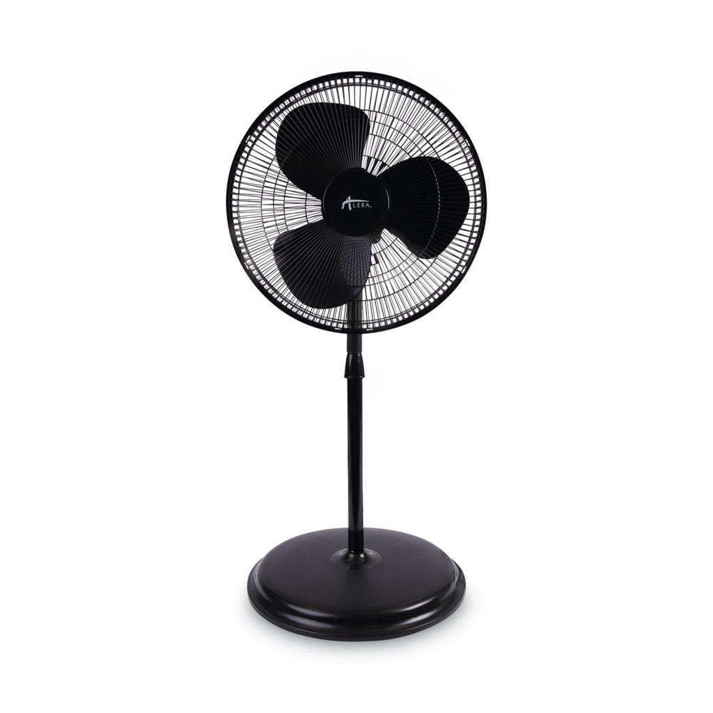 Height adjustable stand (42″ to 49″) gets air where you need it most. Tilting and oscillating functions circulate air effectively in most medium and large rooms. 3-speed settings for low, medium or high fan speeds. Carry handle to easily reposition. Wide disk base for solid stability. Fan Head Size: 16″; Fan Type: Pedestal; Color(s): Black; Maximum Height: 49 1/4″.