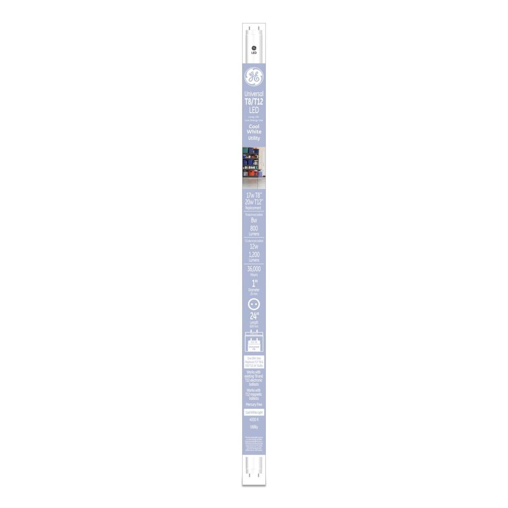 GE’s T8 LED tubes replace 24-inch T81-inch diameterfluorescent bulbs using the existing fixture and electronic ballast. It’s slim size fits in the same fixtures as traditional 24-inch T8 fluorescent bulbs. Why make the switch to LED? GE’s LED tubes are rated to last 36,000 hours. They provide long 16-year life based on six hours use per day, so you’ll replace less often. Bulb/Tube: Tube; Bulb/Tube Technology: LED; Bulb/Tube Type: T8; Brightness: 800 lm.