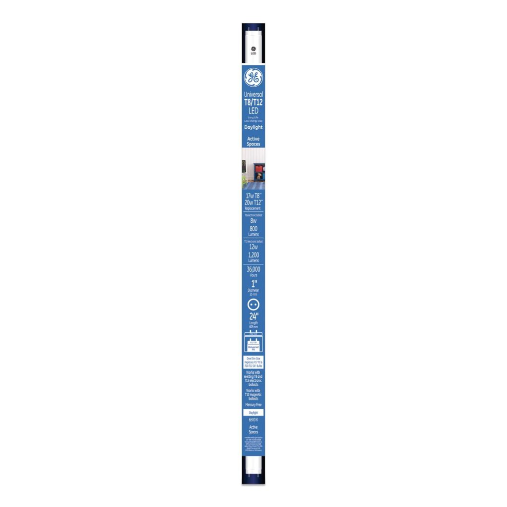 GE’s T8 LED tubes replace 24-inch T81-inch diameterfluorescent bulbs using the existing fixture and electronic ballast. It’s slim size fits in the same fixtures as traditional 24-inch T8 fluorescent bulbs. Why make the switch to LED? GE’s LED tubes are rated to last 36,000 hours. They provide long 16-year life based on six hours use per day, so you’ll replace less often. Bulb/Tube: Tube; Bulb/Tube Technology: LED; Bulb/Tube Type: T8; Brightness: 800 lm.