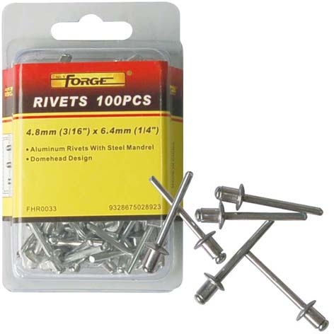 3/16″(4.8mm) x 1/4″(6.4mm) Aluminium Rivets, 100/Pack SKU FHR0033 Add to Cart Add “ Specifications Material Aluminum Quantity 100/Pack Brand Forge Size 3/16" x 1/4" (4.8 mm x 6.4 mm) Manufacturer - No Manufacturer -