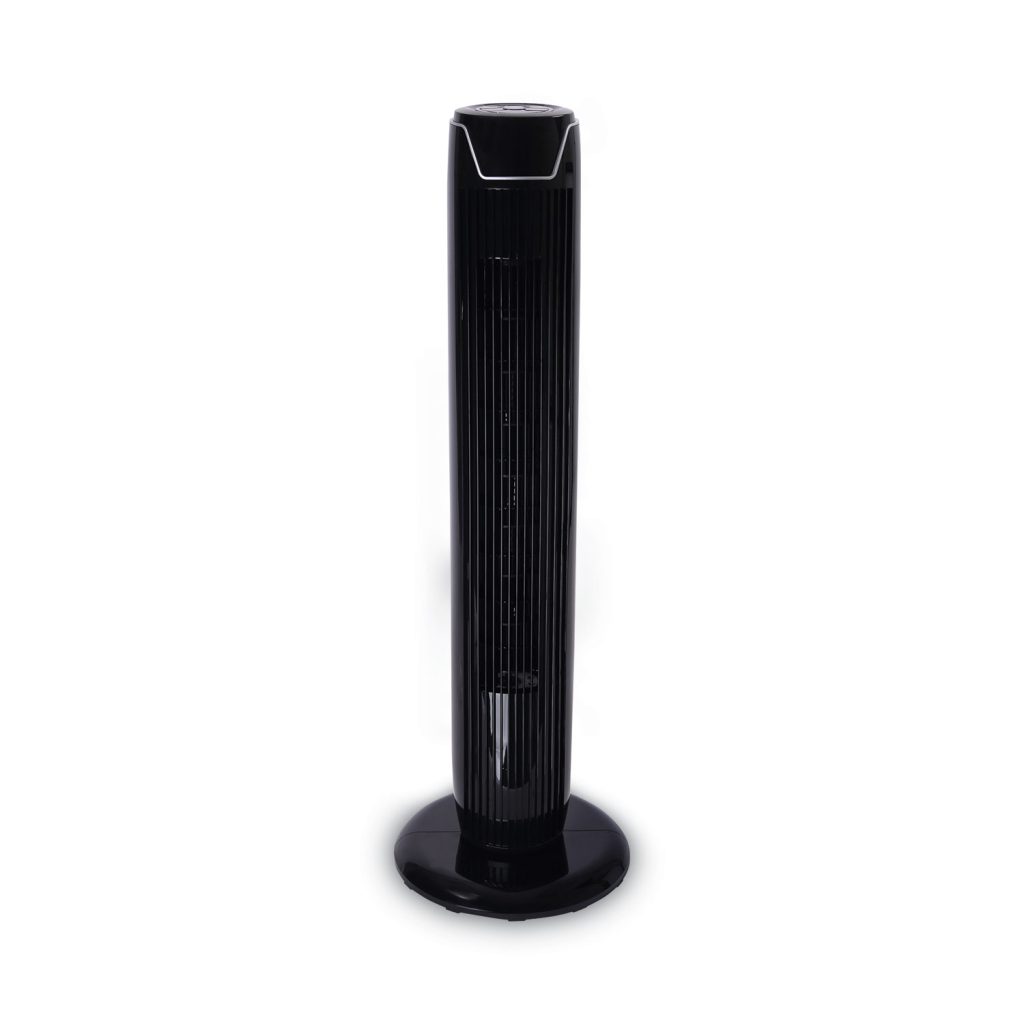 Clever and quiet tower design makes the most of tight spaces. 60 oscillation circulates cool air throughout the whole room. Features three-speed settings, oscillation on/off control, wind modes, and seven-hour automatic shut-off timer. Multi-function remote control and LED display for added convenience. Fan Head Size: 36″; Fan Type: Tower; Color(s): Black; Maximum Height: 36.13″.