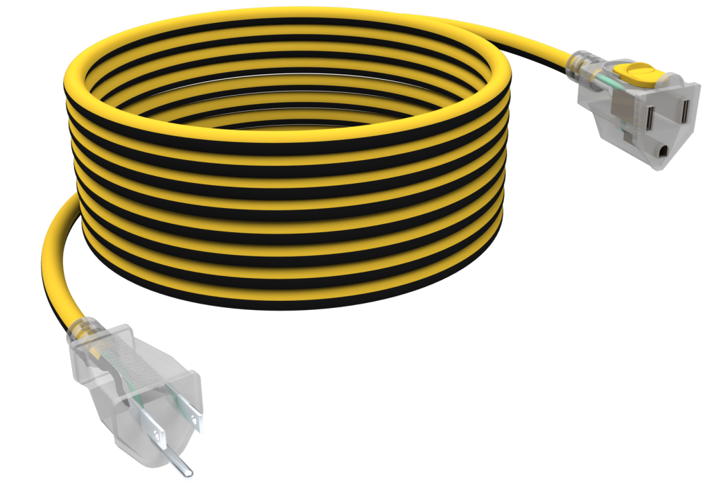 Yellow/Black 50ft 14/3 single outlet grounded outdoor extension cord with lit ends, cord lock, and cord strap.