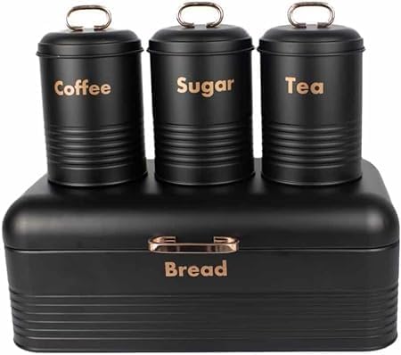 Elevate your kitchen organization with our Black Metal 4-Piece Bread Box Set. This stylish ensemble includes an bread box with a hinged lid and handle, ensuring your bread stays fresh. The set also features three canisters for sugar, coffee, and tea, each equipped with its own lid. Crafted from durable metal, this vibrant black set not only keeps your kitchen essentials organized but also adds a pop of color to your space, marrying functionality with aesthetics seamlessly.