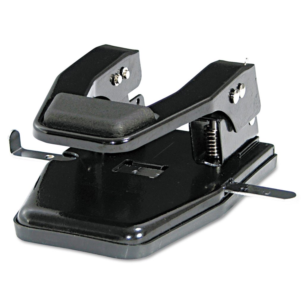Preset for 9/32″ holes, 2-3/4″ center to center. Padded handle locks down for storage. Adjustable paper guide. Removable chip pan. Durable steel base. (Sheet capacity is based on 20-lb. bond.). Sheet Capacity: 40; Operating Method: Manual; Number of Holes: 2; Hole Diameter: 9/32″.