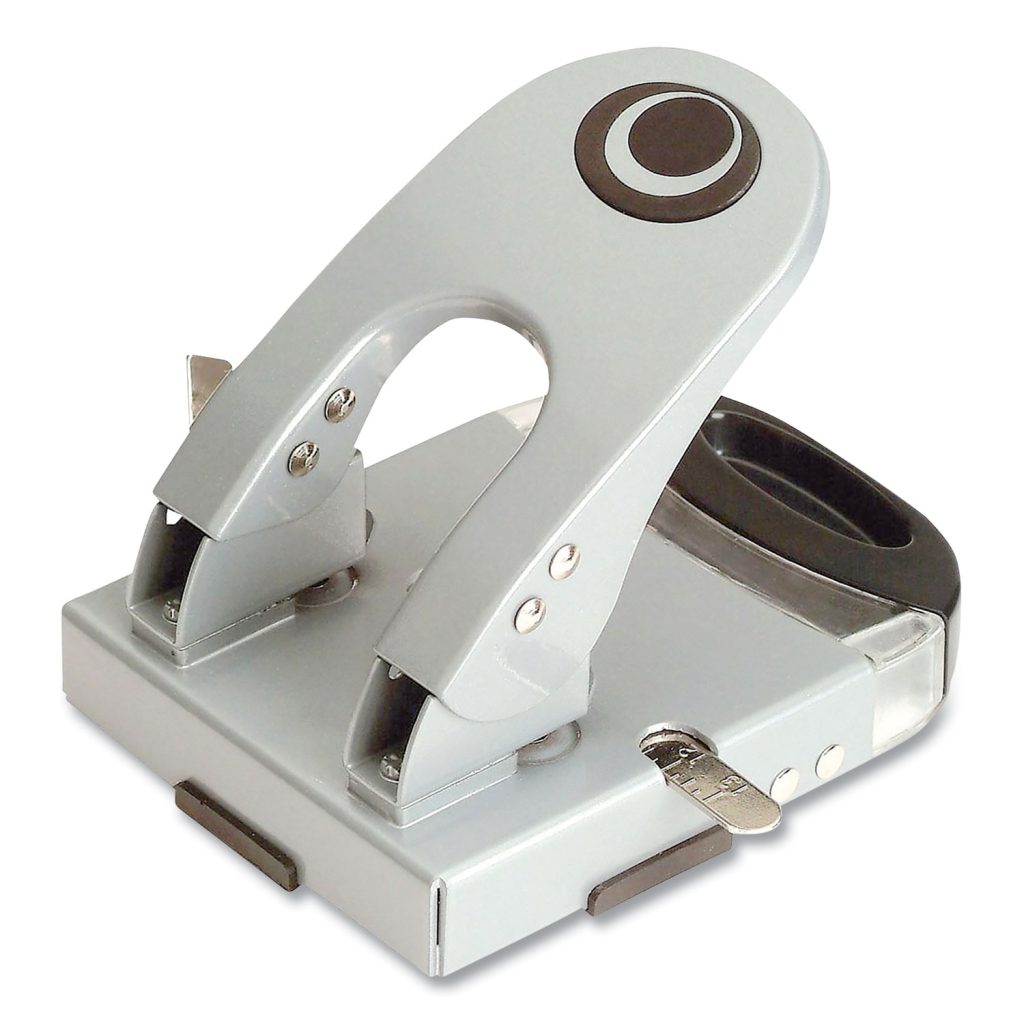 Puncture through up to 50 sheets of paper at one time with this two-hole punch. Featuring a visible window, this tool lets you view chip buildup, so you always know when it’s time to empty the contents. Built-in paper guide makes it easy to get accurate punches. This heavy-duty two-hole punch has a padded ergonomic handle for added comfort. Sheet Capacity: 50; Operating Method: Manual; Number of Holes: 2; Hole Diameter: 1/4″.