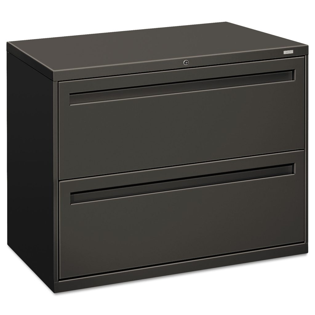 Three-part telescoping slide suspension. Lock secures both sides of drawer. Mechanical interlock allows only one drawer to open at a time to inhibit tipping. Leveling glides adjust for uneven floors. HON “One Key” interchangeable core removable locks. Two-Drawer. Color: Charcoal; Color Family: Gray; Overall Width: 36″; Overall Depth: 18″.