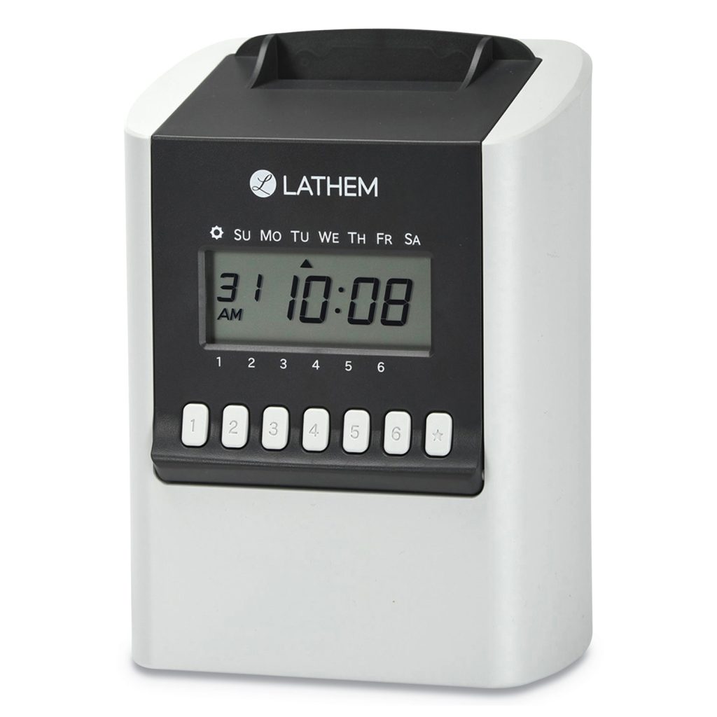 The 700E is a fully automatic simple calculating time clock that can be used to track time for up to 100 employees. It can be set up to either calculate total hours or simply print the date and time employees clock in and out. With support for any pay period, exact minute or rounding time format, and ease of use, the 700E is a great option for any employee time tracking system. The 700E requires Lathem E17 time cards. Time Clock Type: Electronic; Number of Employees: 100; Imprint Style: Hour; Minute; Month; Minute Increments: Decimal Hundredths.