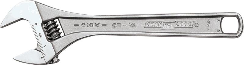 The CHANNELLOCK 810W 10” Wide Adjustable Wrench has a greater jaw capacity to support larger nuts and bolts with thinner, non-protruding jaws for greater access in tight spaces. The combination of a smart and comfortable tapered handle design, precise 4-thread knurl and minimal head width improves performance in everyday use. CHANNELLOCK Adjustable Wrenches are made in Spain and forged from rugged chrome vanadium steel. Jaw Capacity Maximum – 1.34, Joint Thickness – 0.62, Type – Adjustable Wrench