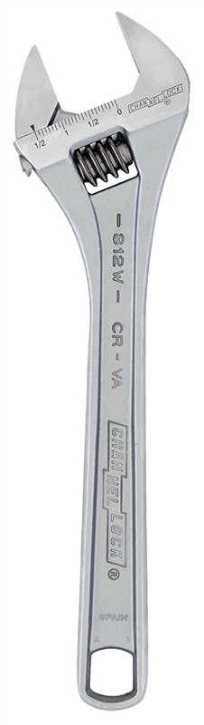 The CHANNELLOCK 812W 12” Wide Adjustable Wrench has a greater jaw capacity to support larger nuts and bolts with thinner, non-protruding jaws for greater access in tight spaces. The combination of a smart and comfortable tapered handle design, precise 4-thread knurl and minimal head width improves performance in everyday use. CHANNELLOCK Adjustable Wrenches are made in Spain and forged from rugged chrome vanadium steel. Jaw Capacity Maximum – 1.54, Joint Thickness – 0.75, Type – Adjustable Wrench