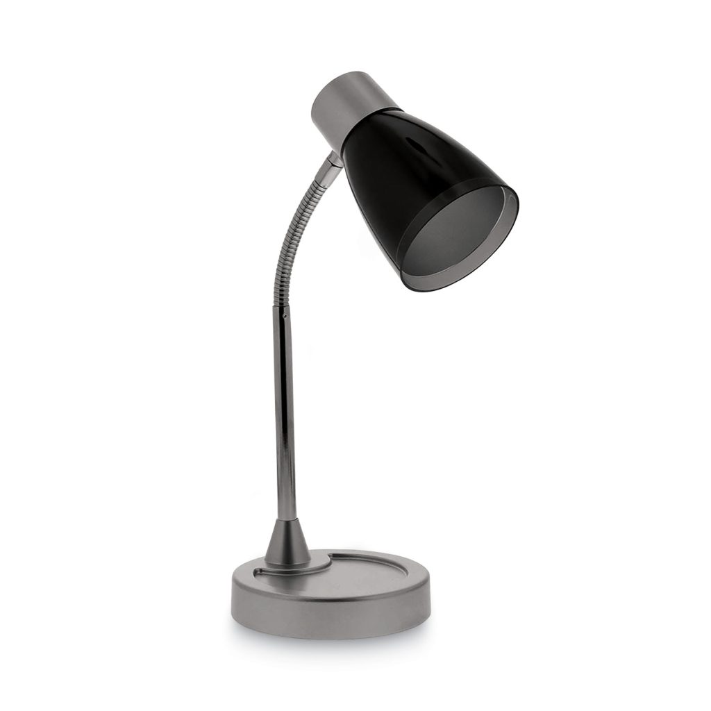 Sometimes simple is all you need. Adjustable LED Desk Lamp features a classic design that’s ideal for any table, worksurface or desktop. Whether in a dorm-room, office or bedroom, this light is there to guide you, and its attractive, compact format takes up a minimal amount space. A polished metal finish provides an element of sophistication, while its acrylic accents deliver an element of contemporary styling. Adjustable lamp head and flexible gooseneck stem allow you to effortlessly position your illumination. Weighted round base ensures stability, even when the neck’s fully extended. Energy-efficient LED bulb provides longer-lasting performance at merely a fraction of the energy consumption, 85% less energy, in fact, when compared to incandescent bulbs, while delivering a brighter, flicker-free light zone that’s clear of annoying shadows, halos and glares. Base Color: Chrome/Black; Plug Type: 2 Prong; Height: 20″; Base Diameter: 4.5″.