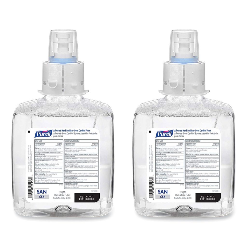 Hand sanitizer that contains ingredients made from natural renewable resources. Kills 99.99% of most common germs that may cause illness. Meets EcoLogo hand sanitizer standard for environmental leadership and proven performance. Scientifically advanced formulation outperforms other hand sanitizers ounce for ounce. Includes a nourishing blend of four skin conditioners. Clinically proven to help maintain skin health. Nothing is harder on germs or easier on hands. For PURELL CS6 Dispensers. Hand Sanitizers Type: Foam; Color(s): Clear; For Use With: PURELL CS6 Dispensers; Capacity (Volume): 1,200 mL.