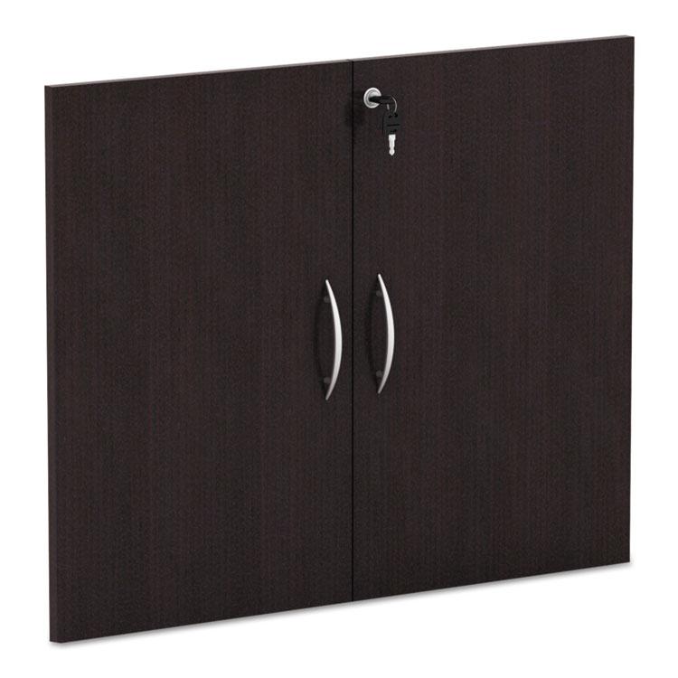 Simply use kit with any bookcase to create enclosed and locked storage space. Use one door kit to enclose 30 inches and lower portion of 44 inch cabinets; two door kits to enclose 56 inch cabinet or lower and upper portions; three kits to fully enclose 82 inch cabinet. The durable woodgrain laminate is water-, scratch- and dent-resistant, featuring protective 3 mm edge banding. Lockable with two fold-over safety keys. Color: Espresso; Color Family: Brown; For Use With: Alera Valencia Series Bookcases; Material(s): Woodgrain Laminate.