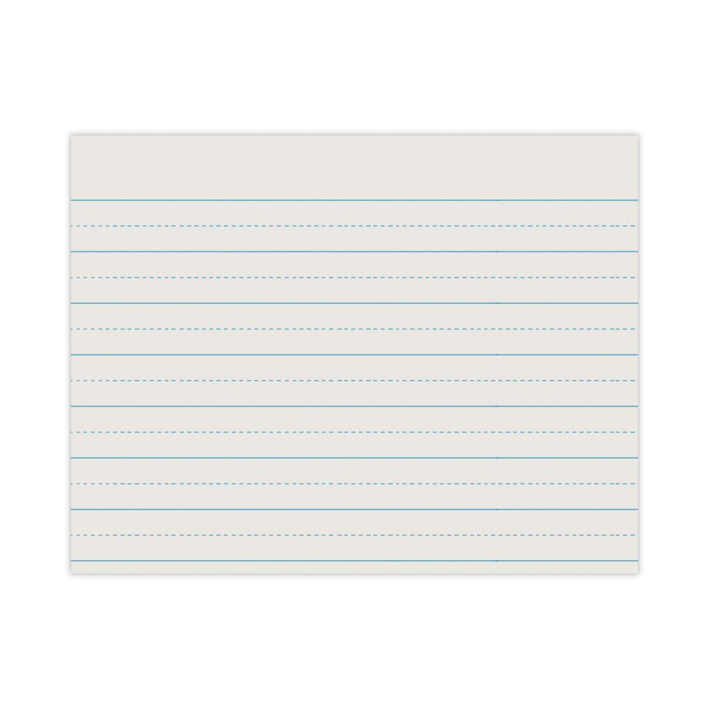 White 30-lb. newsprint has light blue horizontal ruling on both sides. Blue-dotted midline.