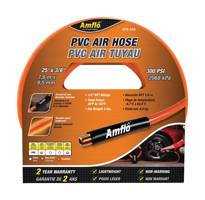Amflo 576-25A Air Hose, 3/8 in OD, 25 ft L, MNPT, 300 psi Pressure, PVC, Orange