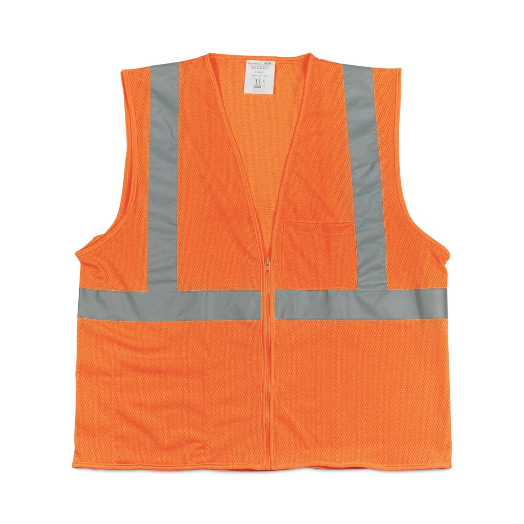 Class 2 apparel is necessary for workers exposed to traffic traveling over 25 mph and who work against complex backgrounds. Hook and loop enclosure for secure closure of vest. Features 2″ silver reflective tape for visibility and matching trim. Apparel Type: Vest; Material(s): Polyester Mesh; Color(s): Hi-Viz Orange; Color Family: Orange.