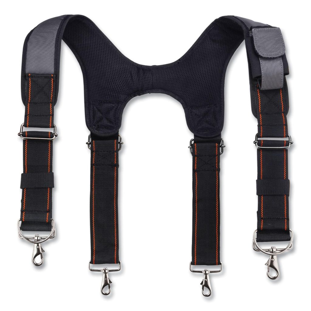 The Arsenal 5560 Tool Belt Suspenders are built for all-day comfort while securing tool belts. Thick foam shoulder padding and gel at key riding points evenly disperses weight to relieve pressure from the hips and back. Durable nickel-plated, spring-loaded clips easily secure the suspenders to any tool belt or rig. These padded tool belt suspenders are made with heavy-duty and puncture-resistant 1680D ballistic polyester for long-lasting wear. Featuring a small front strap pocket and two D-rings for attaching keys, glove clips, tool lanyards and more. One size fits most, the quick-adjust suspender style makes for a comfortable and custom fit on a variety of body sizes. Ideal for any work that requires regular use of a tool belt, including electrical, carpentry, contracting, construction, shop work and more. Type: Suspenders; Material(s): Polyester; Color(s): Gray; Shape: H-Back.