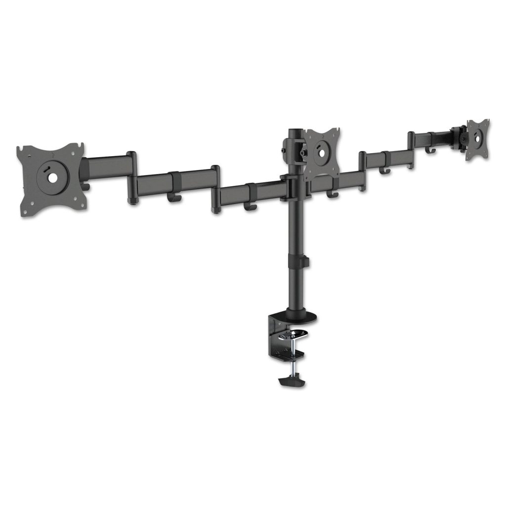Fits monitors up to 27″ and up to 18 lbs per monitor. Height easily adjusted for an optimal ergonomic position. Fully articulating design provides 360-degree rotation, 180-degree swivel and 45-degree tilting for any viewing perspective. Cable clips for cable management. Monitor arm attaches to the desk, via a clamp or grommet (both included). For Three Monitors. OEM/Compatible: Compatible; Workstation Type: Mobile Workstation; Traditional Desk/Table; Width (Max): 57″; Depth (Max): 4.7″.