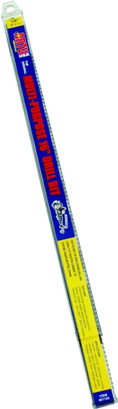For rotary or percussion drilling. Chrome vanadium steel shank with cobalt and tungsten carbide tip that withstands temperatures up to 1900 deg F. Special negative back grinding enables tip to bore through applications such as masonry, ceramic tile, concrete, brick, fiberglass, plexiglass, cast metals, hardened steel, granite, marble, woods and plastic with a filing action rather than a cutting action. No center punch required, eliminates walking and can be re-sharpened. This includes aluminum, angle iron, copper, galvanized pipe, brass and stainless steel.