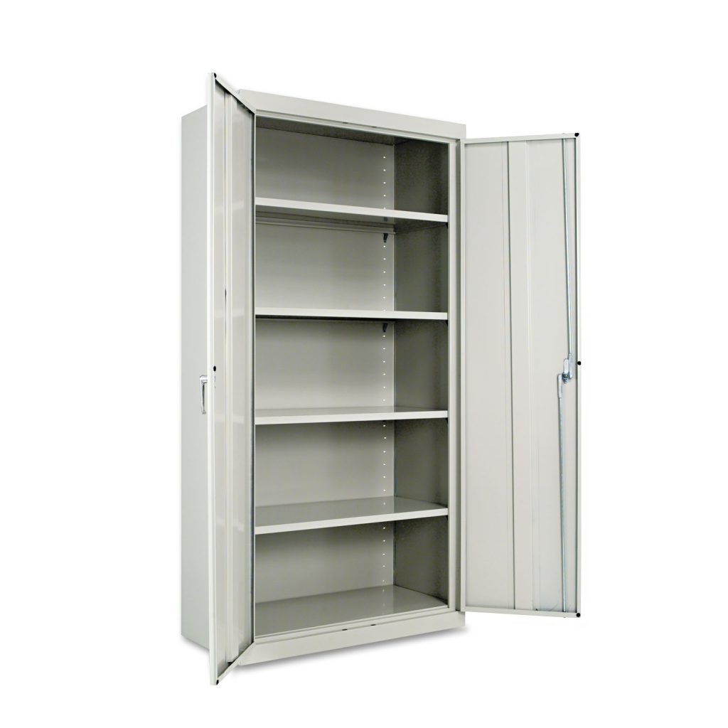 Assembled storage cabinet with three-point locking bar system locks top, bottom and doors. Doors open 180 for easy access to contents. Cabinet made of industrial grade steel with satin chrome double handles. 72″ High CabinetFour adjustable shelves. Color: Light Gray; Overall Width: 36″; Overall Depth: 18″; Overall Height: 72″.