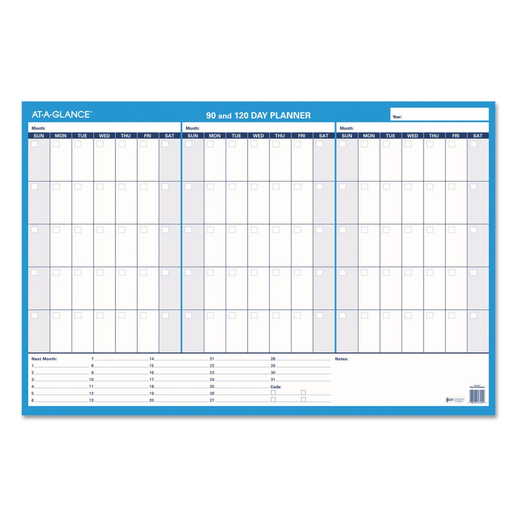 At-A-Glance 90/120-Day Erasable Wall Planner – 36″ x 24″ Sheet Size – Blue – Erasable, Laminated – 1 Each| Erasable wall planner is ideal for planning office meetings and events. One side features 90-day planning with 1-5/8″ x 3″ unruled daily blocks, and the other has 120-day planning with 2-7/16″ x 1-13/16″ unruled daily blocks. Both sides are undated and offer notes space for next month’s plans. Thick laminated, write-on/wipe-off surface allows easy changes and offers ample writing space in each block. Bright white background allows easier viewing and reading. Wall planner also includes a black, wet-erase marker.Erasable wall planner is ideal for planning office meetings and events. One side features 90-day planning with 1-5/8″ x 3″ unruled daily blocks, and the other has 120-day planning with 2-7/16″ x 1-13/16″ unruled daily blocks. Both sides are undated and offer notes space for next month’s plans. Thick laminated, write-on/wipe-off surface allows easy changes and offers ample writing space in each block. Bright white background allows easier viewing and reading. Wall planner also includes a black, wet-erase marker.
