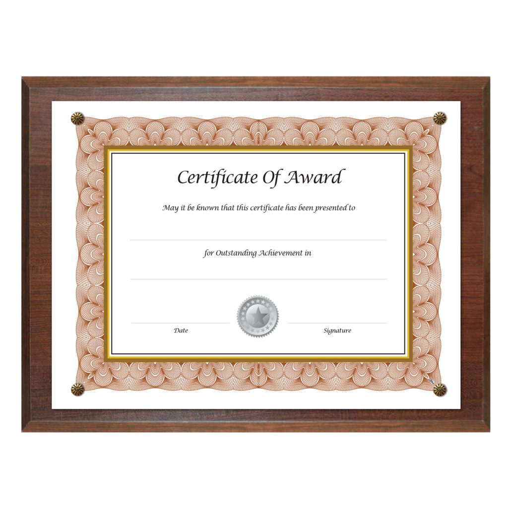 Showcase your accomplishments, while preserving them for years to come. The clear acrylic faceplate on Award-A-Plaque easily lifts to change documents. It includes a blank Certificate of Award and four decorative tacks. The frame conveniently hangs vertically or horizontally. Frame Type: Certificate/Document; Frame Material: Wood; Frame Color: Walnut; Color Family: Walnut.