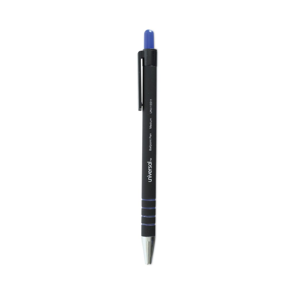 Universal Retractable Ballpoint Pen features a rubberized barrel with ringed, no-slip grip thats easy to hold. The stable and rubberized barrel provides exceptional comfort and a secure grip for precision writing. The quick-drying, water-resistant ink won’t smear or run, keeping your documents safe and legible. The retractable pen protects pockets and purses by keeping ink inside the pen when closed.