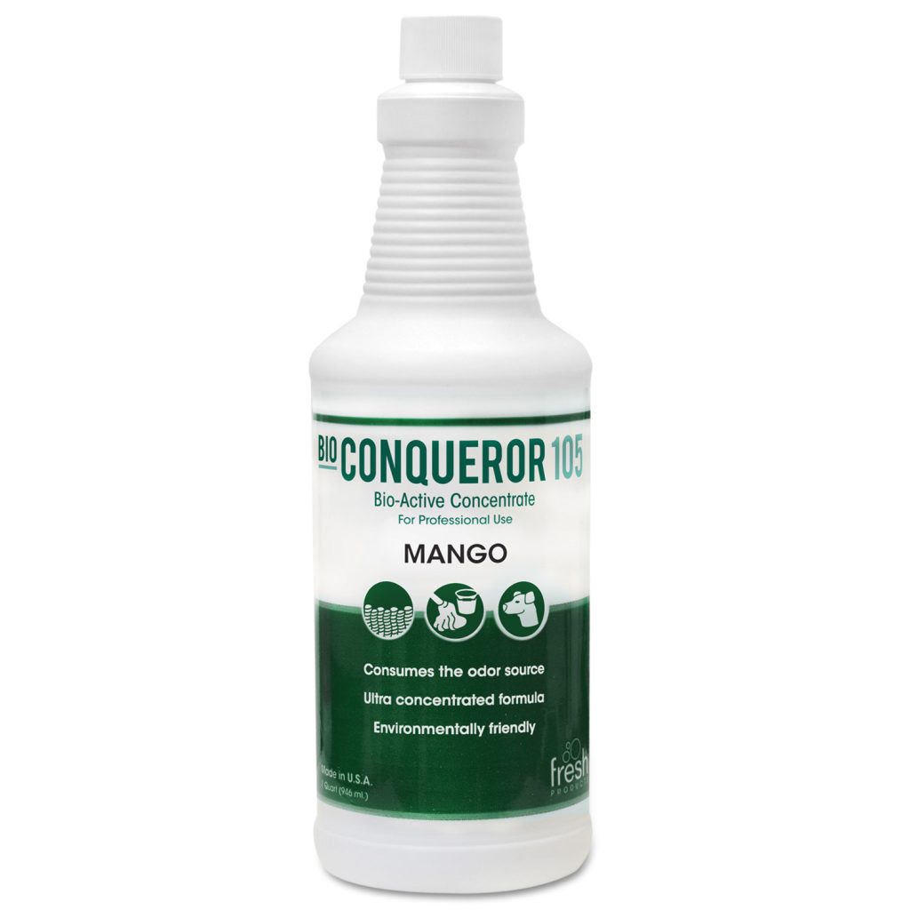 Concentrated enzymatic odor counteractant works quickly and efficiently. Commercial-grade product eliminates odors at their source by digesting the molecules that create unwanted smells. Use it at full strength or diluted, without sacrificing performance. Ideal for use on most tough odor problems: pets, urinals and toilets, dumpsters, drains, etc. Scent: Mango; Physical Form: Liquid; Application: Odor Control; Capacity (Volume): 32 oz.