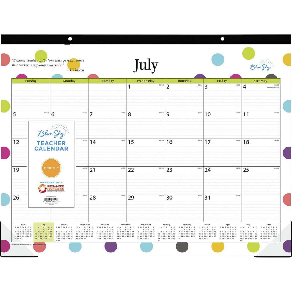 Blue Sky Teacher Dots Design Desk Pad – Julian Dates – Monthly – 1 Year – July 2020 till June 2021 – Desk Pad, Desktop – Multi – 0.1″ Height x 22″ Width – Bleed Resistant Paper, Easy Tear, Perforated, Notes Area, Appointment Schedule, Reminder Section, Reference Calendar, Write-on – 1 Each| Desk pad with a colorful dots design makes a great addition to any home or office desk. Thick, premium-quality pages reduce ink bleed-through to ensure your writing stays legible. Easy-to-tear pages are perforated to remove cleanly at the end of each month. Clear corners allow you to tuck in the bottom edges of each month to keep your pages flat. Monthly format offers ample writing space to keep track of all your notes, ideas, appointments, reminders and more. 12-month calendar reference along the bottom of each page allows you to easily refer back to previous or future dates. Desk pad ranges 12 months from July to June.Desk pad with a colorful dots design makes a great addition to any home or office desk. Thick, premium-quality pages reduce ink bleed-through to ensure your writing stays legible. Easy-to-tear pages are perforated to remove cleanly at the end of each month. Clear corners allow you to tuck in the bottom edges of each month to keep your pages flat. Monthly format offers ample writing space to keep track of all your notes, ideas, appointments, reminders and more. 12-month calendar reference along the bottom of each page allows you to easily refer back to previous or future dates. Desk pad ranges 12 months from July to June.