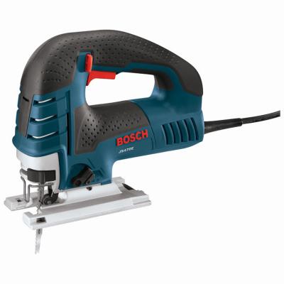 The Bosch JS470E top-handle jig saw provides unsurpassed cut precision. Finish carpenters and kitchen and bath installers will appreciate the best-in-class 7 A motor and variable-speed control, making this saw an excellent choice for curve-cutting. A dial on the back of the tool controls the maximum speed and the accelerator trigger controls the operating speed. Built with an aluminum gearbox and an insulated cover, this jig saw comes with a low-vibration plunging design and constant response circuitry for consistent speed under load. It has a large die-cast aluminum footplate. The JS470E multidirectional blade clamp delivers great grip of T-shank blades (but it does not accept U-shank blades). The blade-ejection lever that eliminates need to touch hot blades. It has a dust blower for max cut-line visibility.