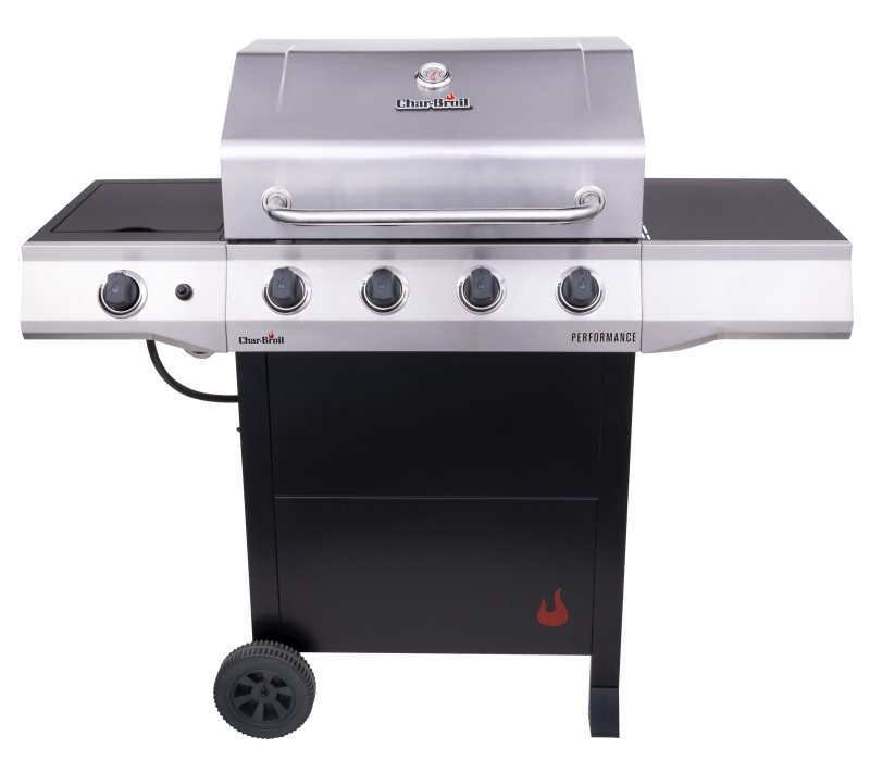 Char-Broil Performance Gas Grill with Chef’s Tray, Liquid Propane Gas, 425 sq-in Primary Cooking Surface Area, 130 sq-in Secondary Cooking Surface Area, 2 ft 1/2 in Cooking Surface Width, 1 ft 5-3/32 in Cooking Surface Depth, 32,000 Btu, 4 Burners, Cast Iron Grate, Electronic Ignition, Thermometer Included: Yes, Side Shelf Included: Yes, 7 in Wheel, 900 deg F, Free-Standing Installation, Steel Body, Black/Silver, Dimensions: 3 ft 9-13/32 in H x 4 ft 2-5/16 in W x 1 ft 8-3/32 in D