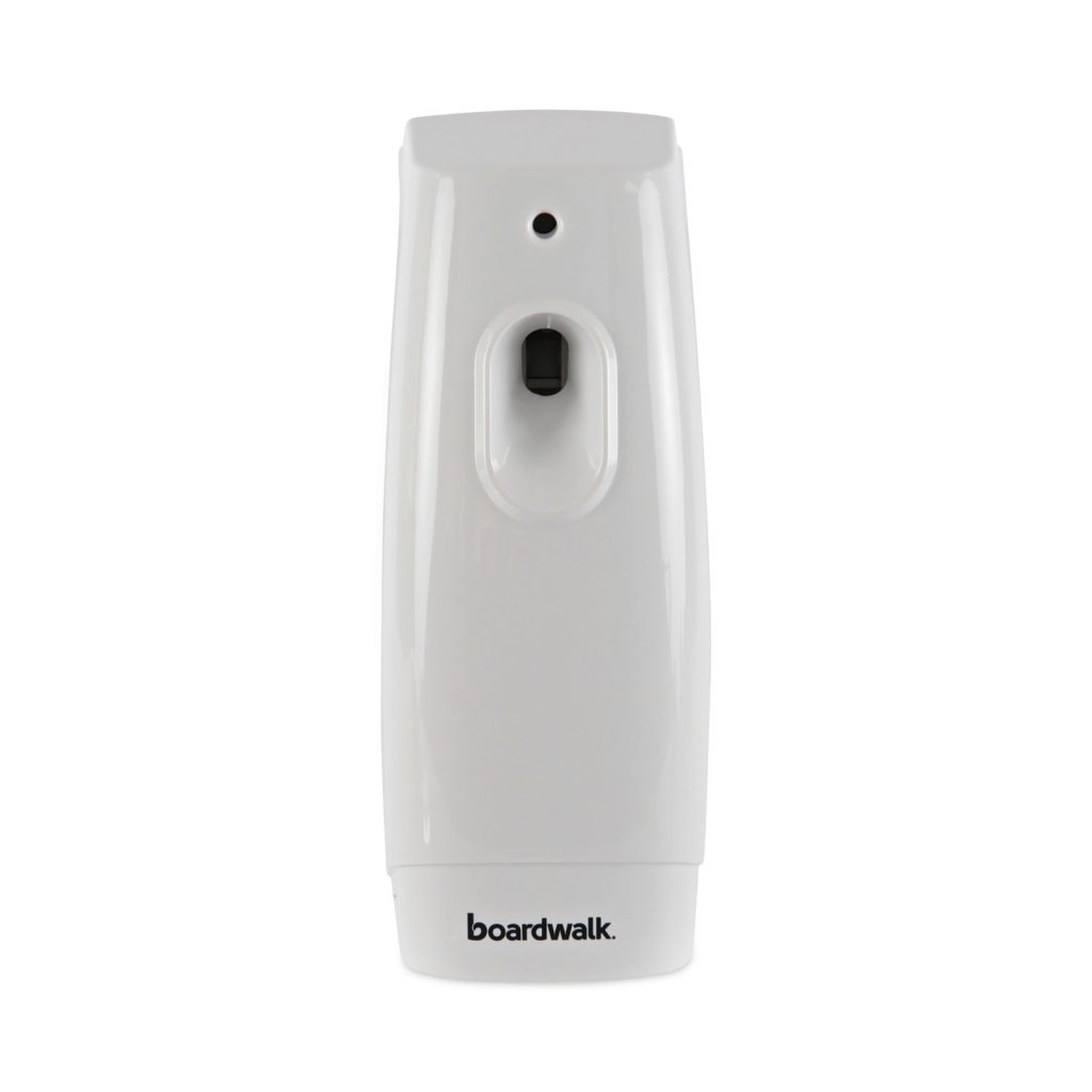 Classic metered dispenser automatically sprays fragrance every 15 minutes. Effective odor control for up to 30 days when used with Boardwalk Air Freshener Refills (sold separately). Operates on four AA batteries (not included). Material(s): Plastic; Color(s): White; Height: 9.5″; Width: 4″.