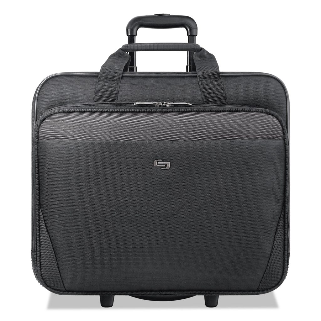 Fully padded 17.3″ laptop compartment. Internal iPad/tablet pocket. Front zippered pocket. Front zip-down organizer section with key clip. Divided file compartment. Padded carry handles. Hidden push-button telescoping handle system. Inline skate wheels. For Use With: Laptops; Color(s): Black; Color Family: Black; Material(s): Polyester.