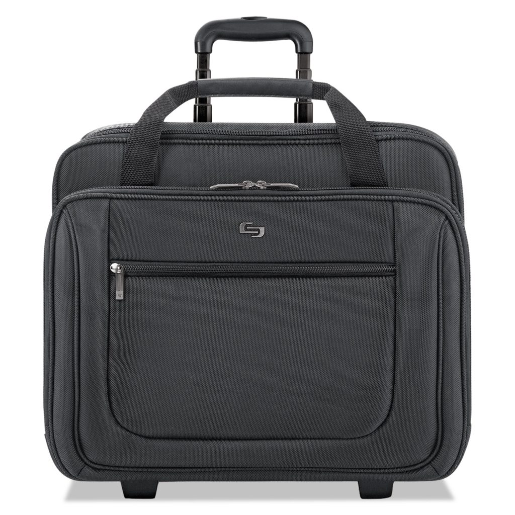 Fully padded 17.3″ laptop compartment. Front zippered pocket. Full size front zip-down organizer section. Divided file compartment. Padded carry handles. Hidden push-button telescoping handle system. Inline skate wheels. For Use With: Laptops; Color(s): Black; Color Family: Black; Material(s): Polyester.