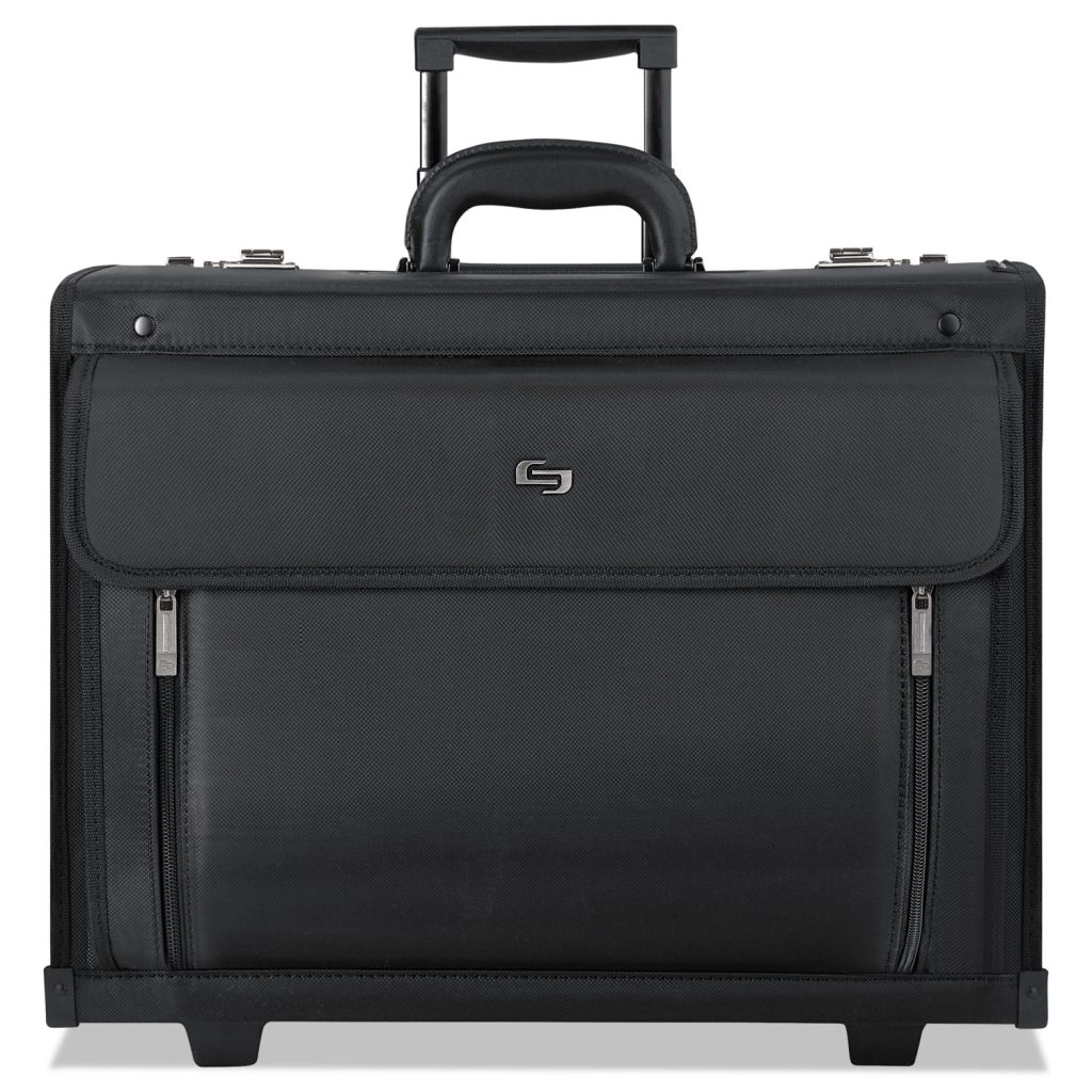 Fully padded 16″ laptop compartment. Full size front zip-down organizer section and file pocket. Dual combination locks. Sturdy carry handle. Telescoping handle system. For Use With: Laptops; Color(s): Black; Color Family: Black; Material(s): Polyester.