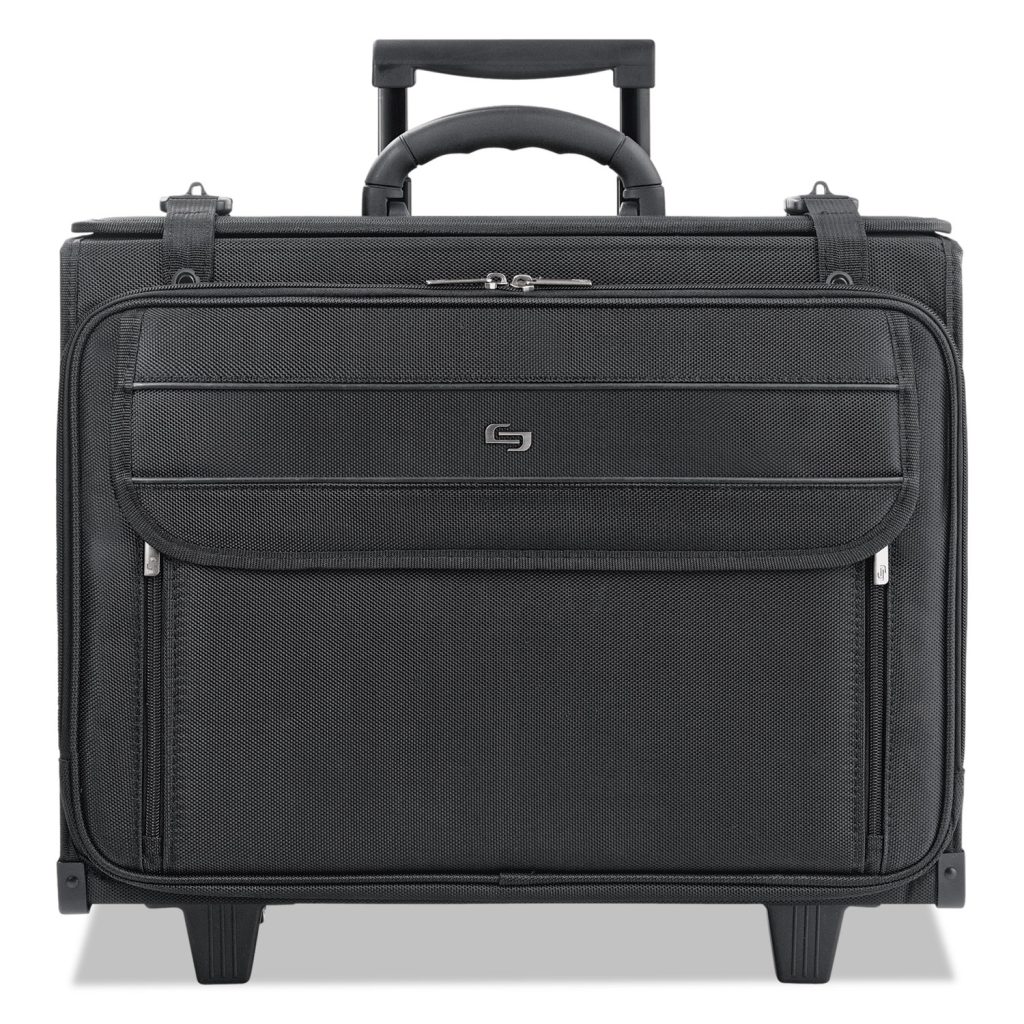 Features hanging file system. Removable fully padded 17.3″ laptop sleeve. CheckFast sleeve design allows you to pass through airport security faster. Full size front zip-down organizer section and file compartment. Sturdy carry handle. Telescoping handle system. Speed buckle closure. For Use With: Laptops; Color(s): Black; Color Family: Black; Material(s): Polyester.