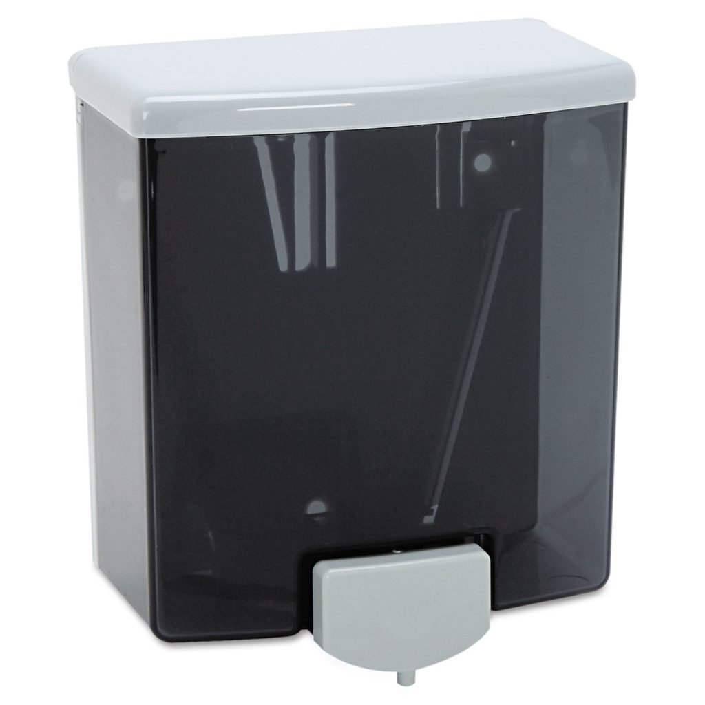 Two-tone styling in black and gray. Push-in valve directs operating pressure toward wall. Corrosion-resistant valve dispenses liquid soaps, lotions and synthetic detergents. Translucent container for soap level visibility. Concealed wall fastening. Easy top-filling. 40-fl. oz. capacity. Dispenser Type: For Liquids; Capacity (Volume): 40 oz; Mounting: Wall; Material(s): Plastic.