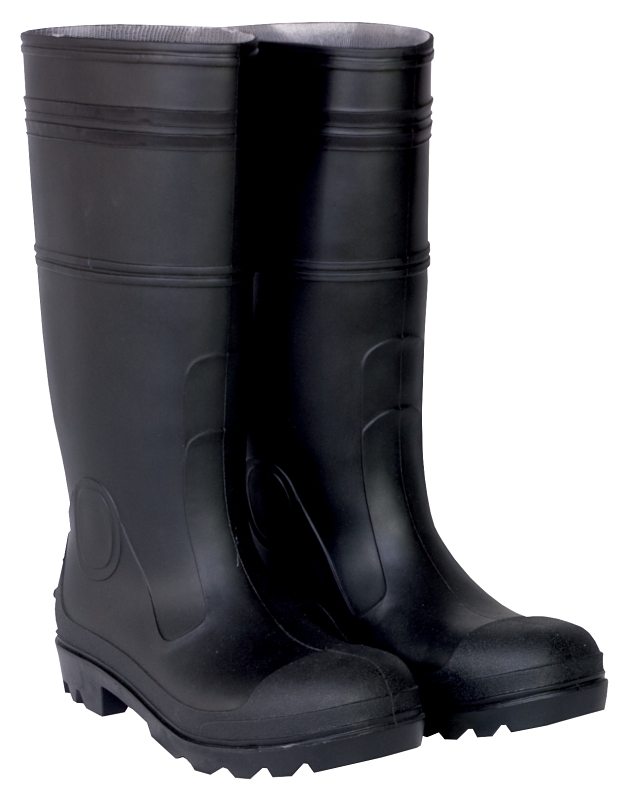 These standard black PVC rain boots have a durable cleated sole for improved traction and are sized to be worn with your thick socks.