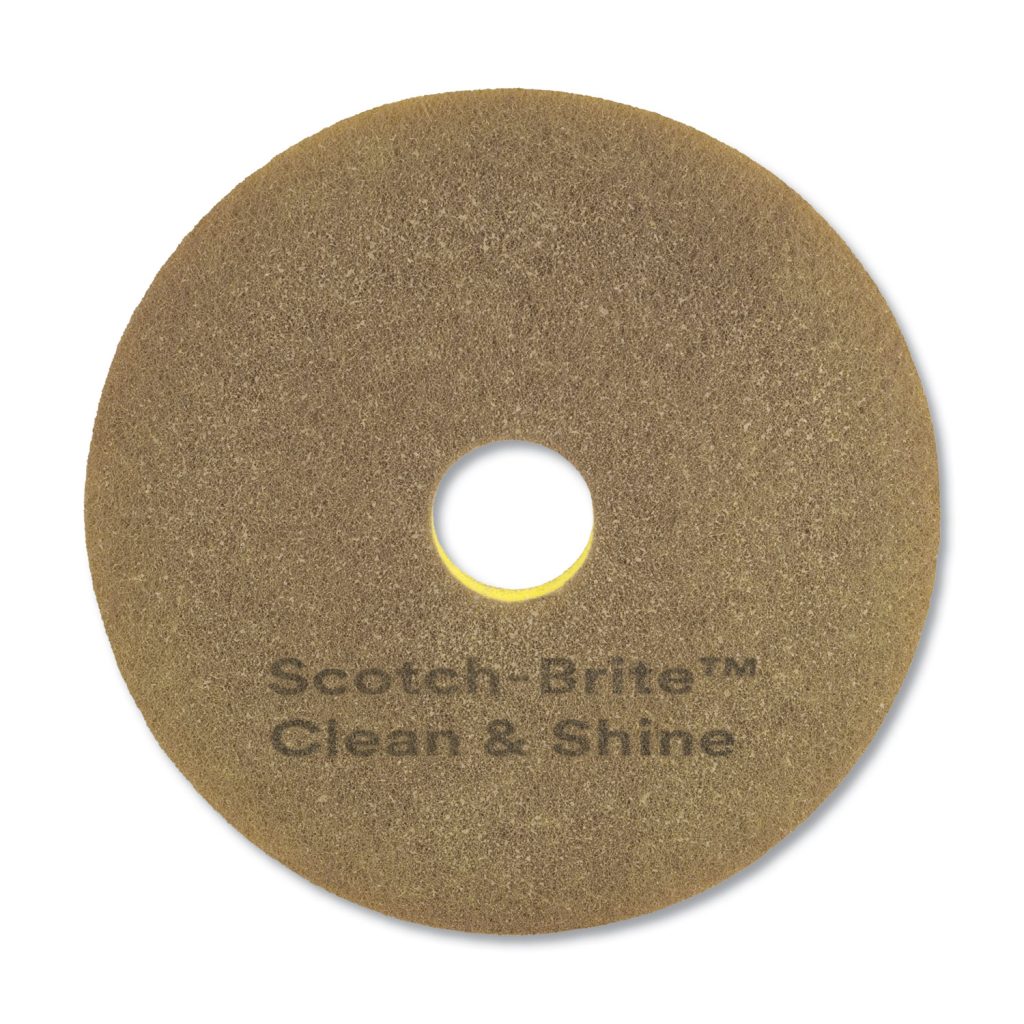 Cleans and shines in the same step, using only a low-speed scrubber. Save costs and labor by reducing or eliminating the need to burnish. Removes black marks three times faster than traditional cleaning pads. Two-sided pad lasts longer than traditional cleaning pads. Effective on most coated and uncoated hard floors including VCT, vinyl, rubber, marble, stone, terrazzo, granite and concrete with only water or neutral cleaner. Application: Cleaning/Polishing; Diameter: 17″; Color(s): Yellow/Gold; Color Family: Brown.