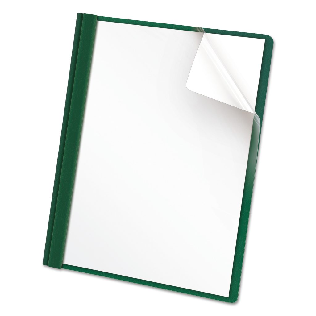 Clear view draws the reader in. First page can include report name and customized graphics. Standard-grade leatherette embossed back cover. Front Cover Color(s): Clear; Color Family: Clear; Back Cover Color(s): Hunter Green; Sheet Size: 8.5 x 11.