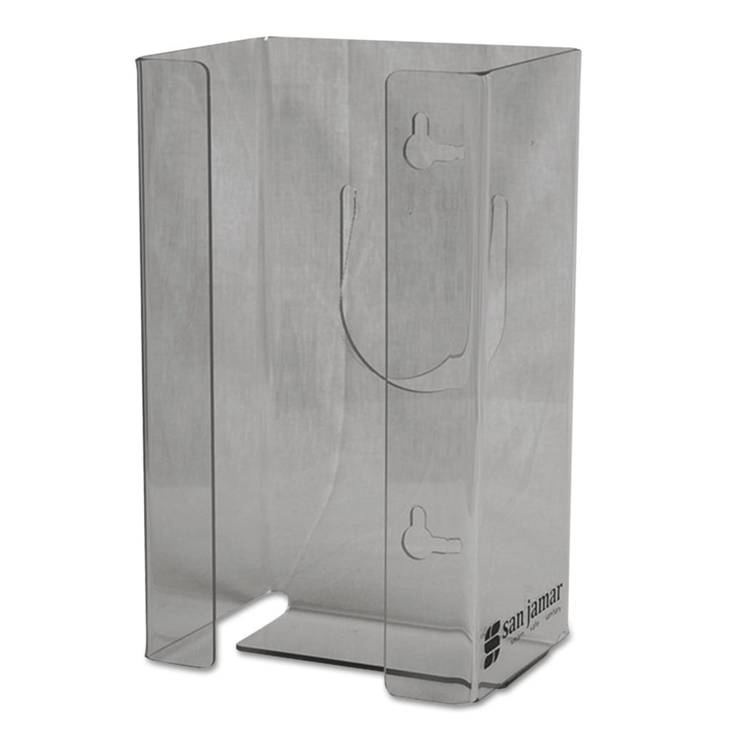 When sanitary conditions absolutely must be maintained, such as in food-preparation areas and hand-washing stations, this dispenser is ideal. Rigid, easy-to-clean shell minimizes the potential for glove contamination and helps prevent damage to cardboard boxes. Innovative spring-load, slip-free design ensures that glove boxes remain securely in place. Single-box dispenser fits perfectly in tight areas where space is at a premium. Keyhole-style slots simplify wall mounting. Material(s): Plexiglas; Mounting: Wall; Height: 10″; Width: 5 1/2″.
