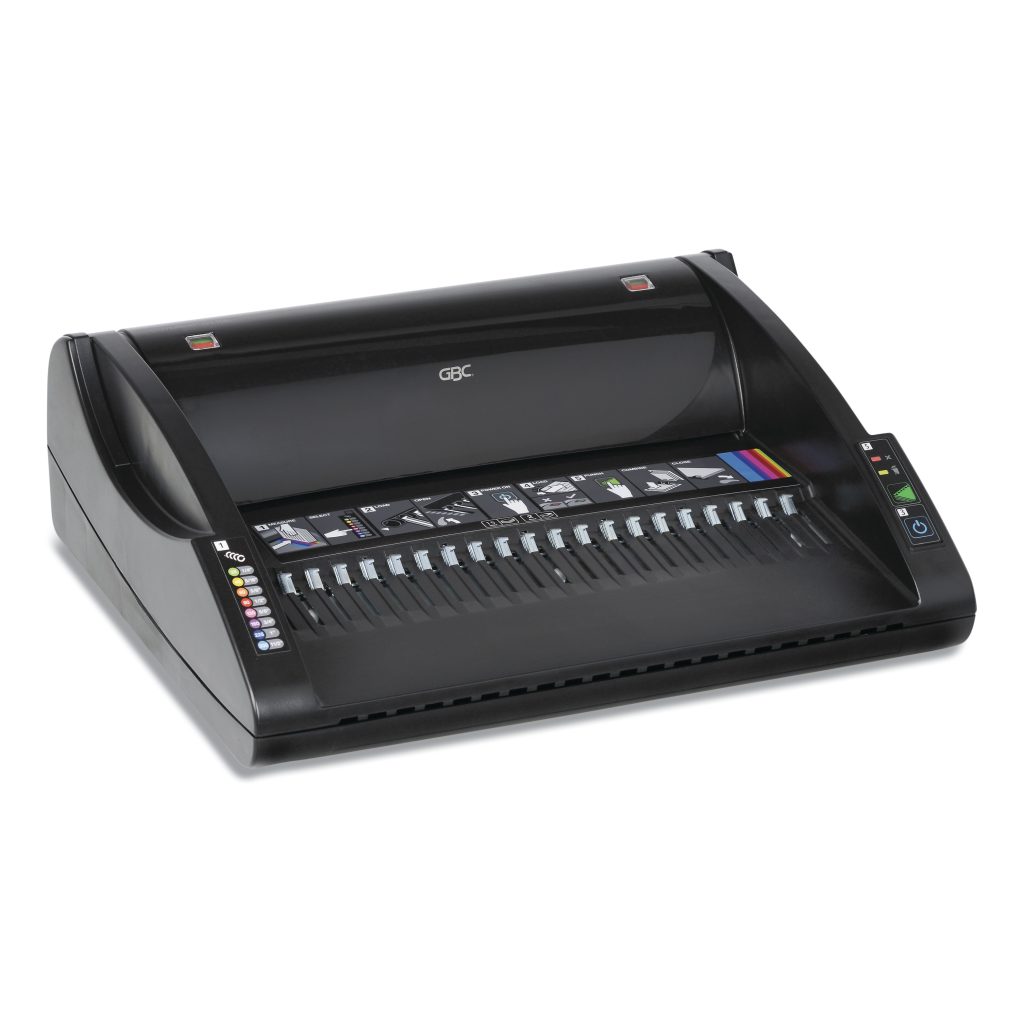 2-in-1 electric binding: uses both traditional CombBind and editable ZipBind spines. QuickStep instructions are easy to follow ensuring simple operation. Color-coded document size guide helps determine the correct spine size quickly. One-touch electric punching up to 15 sheets with the push of a button. Includes comb selection guide and adjustable edge guide to make perfect binding of up to 330 sheets a snap. Binding Spine Type: Comb; Binding Sheet Capacity: 330; Punching Sheet Capacity: 15; Maximum Binding Edge: 11″.