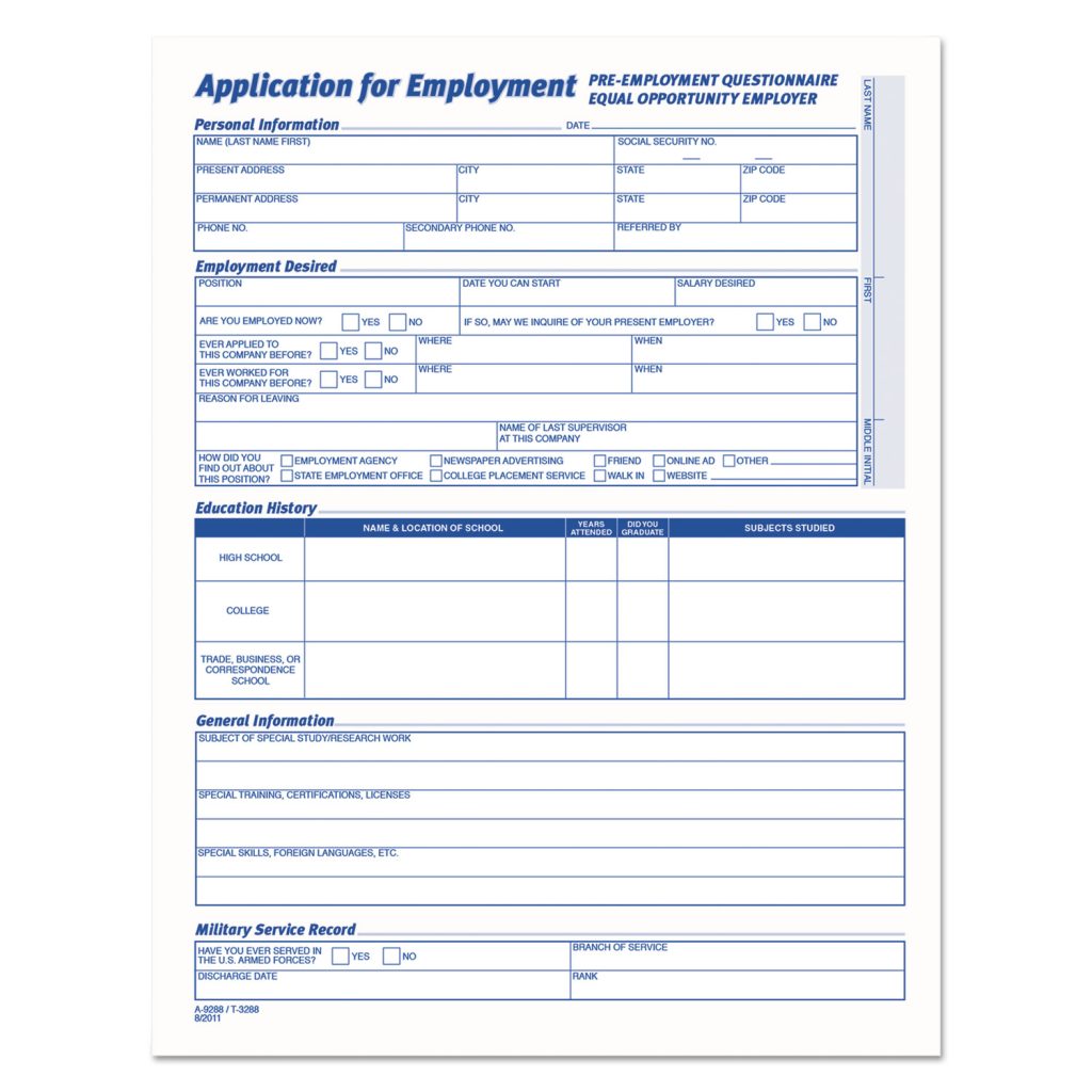 The most comprehensive inquiry into a candidate’s history, including past employment, references, education, personal information and check-offs for special questions. Full page for interviewer’s appraisal. Complies with state and federal laws prohibiting discrimination. Form Size: 8 1/2 x 11; Forms Per Page: 1; Form Quantity: 25; Sheet Size: 17 x 11.