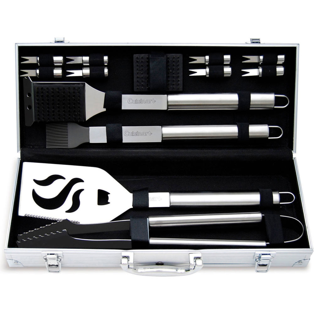 The Cuisinart Deluxe 14 Piece Grilling Tool Set includes all the necessary tools to make your grilling experience easy and convenient. This durable set of stainless steel tools includes a Chef’s Spatula, Grill Tongs, Silicone Basting Brush, Cleaning Brush, Extra Cleaning Brush Head and 4 Pairs of Corn Holders. Each tool is designed with elongated handles and a hanging ring for convenient placement during grilling time. When you are finished grilling, store the whole set in the durable aluminum case until the next time you grill.