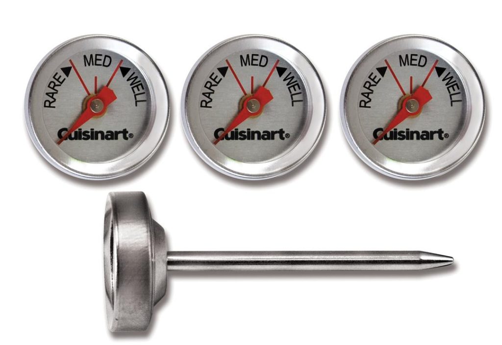 Cook steaks with gourmet-like precision with this 4-piece set of Cuisinart Outdoor Grilling Steak Thermometers. These simple gauges help you cook your steaks with gourmet-like precision–always to the desired cooking level and never undercooked. Simply insert the reusable stainless steel thermometer into your steak to get a fast, accurate read of the current cooking level–rare, medium, and well done. The 2-inch fine-pointed probe checks doneness without cutting into meats and losing juices. Dishwasher safe for convenient cleaning and sterilizing.