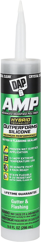 DAP AMP Gutter and Flashing Sealant, Paste, Clear, Odor/Scent: Slight, Net Content: 9 oz, Compositions: 1,2-Benzenedicarboxylic Acid, Di-C9-C11-Branched, Trimethoxyvinylsilane, Diisononyl Phthalate (DINP), 3-(Trimethoxysilyl)propylamine, Organosilane Ester, VOC Content: 23 g/L, Boiling Point: 100 deg C, Density: 1.03 g/cu-cm