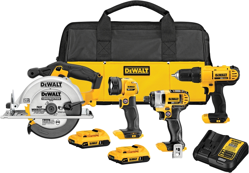 - (1) DCD771 20 V Max 1/2 in Cordless Drill Driver (1) DCF885 20 V Max 1/4 in Cordless Impact Driver (1) DCS393 20 V Max 6-1/2 in Cordless Circular Saw (1) DCL040 20 V Max Cordless LED Work Light