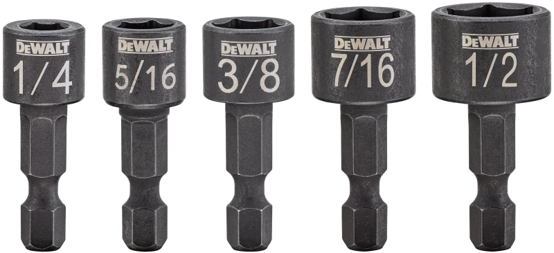 DeWALT Nutsetter Set, Compact, Specifications: 1/4 in Hex Shank, Steel, 5 Piece, Includes: (1) 1/4 in, (1) 5/16 in, (1) 3/8 in, (1) 7/16 in, (1) 1/2 in Nutsetters