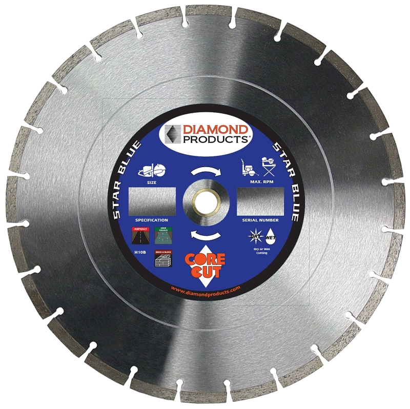 DIAMOND PRODUCTS Star Blue Saw Blade, H8B Grade, 0.475 in Segment Height, 18 in Diameter, 1/8 in Thickness, 1 in Arbor, Diamond Blade, 3/8 in Cutting Depth, Applicable Materials: Masonry